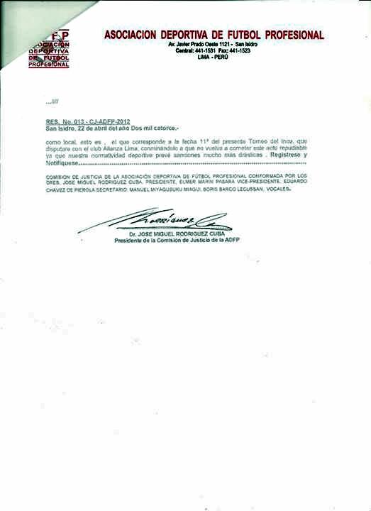 De oficio, la CJ-ADFP presidida por José Rodríguez Cuba, resolvió: "Sancionar al club Real Garcilaso a JUGAR A PUERTA CERRADA en su próximo partido correspondiente a la fecha 11 del presente Torneo del Inca que disputará con el club Alianza Lima, conminándolo a que no vuelva a cometer este acto repudiable ya que nuestra normatividad deportiva prevée sanciones mucho más drásticas", se lee en la Resolución N° 013 - CJ-ADFP-2014.